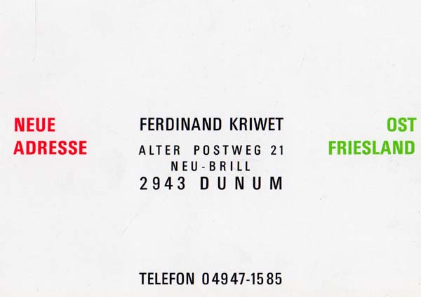 Kriwet, Ferdinand: Adressänderung. 15 x 11 cm. 1 Blatt. OKarton-Karte. Sehr gutes Exemplar. Karte mit Adressänderung Ferdinand Kriwets, verso ganzseitig mit handschriftlichen Notizen Kriwets versehen zu Seneca, Briefe an Lucilius. 10 Zeilen.