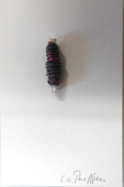 Paeffgen, C. O.: Eine Aktion. Aktion bei der industriell auf ein Pappröllchen aufgespulte Nähseide von C.O.Paeffgen manuell mit verzinktem Draht umwickelt wird demonstriert durch Fotos und ein Objekt. Auflage 55 Exemplare. Köln. Wolfgang Hake Verlag. 1975. 21,0 x 14,5 cm. Unpaginiert. OFranzösisch-Broschur. Umschlag minimal fleckig, Rücken gering lesespurig, sonst sehr gutes Exemplar. Objektbuch, Nummer 30 / 55 maschinell nummerierten Exemplaren. Enthält 11 lose montierte Schwarz-Weiß-Fotografien sowie zahlreiche mit einer kreisrunden Ausstanzung versehene Blatt, an deren Ende eine mit verzinktem Draht umwickelte und auf Karton montierte Garnrolle lose eingelegt ist. Auf dem Träger des Objekts handschriftlich signiert. Die Fotos der Garnrole sind von Eduard Noack.