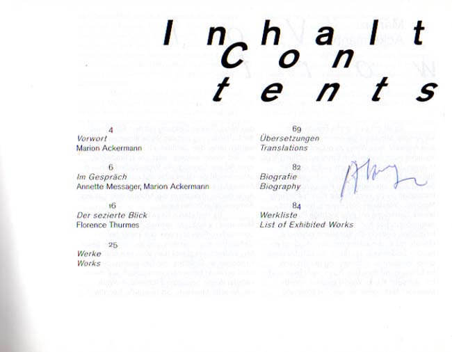 Messager, Annette: Exhibition / Exposition. [Kunstsammlung Nordrhein-Westfalen, Düsseldorf, K21 Ständehaus, 27. September 2014 bis 22. März 2015]. 1. Auflage. Düsseldorf. Stiftung Kunstsammlung Nordrhein-Westfalen. 2014. 20 x 26 cm. 87 S. OLeinen. Sehr gutes Exemplar. Handschriftlich im Inhaltsverzeichnis von Annette Messager signiertes Exemplar (Signatur in blauem Kugelschreiber). Texte in Deutsch und Englisch. Mit Beiträgen von Marion Ackermann, Annette Messager und Florence Thurmes. Durchgehend mit meist farbigen Abbildungen versehen.