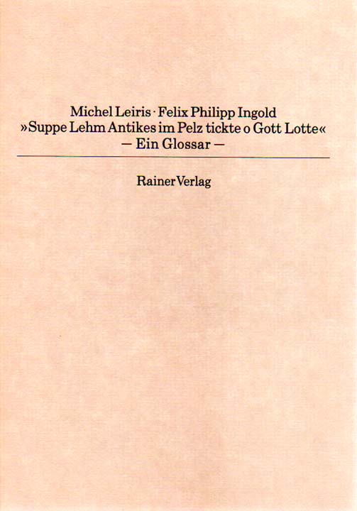 Leiris, Michel [und] Felix Philipp Ingold: Suppe Lehm Antikes im Pelz tickte o Gott Lotte. Ein Glossar. Auflage: 200 nummerierte und signierte Exemplare. Berlin. Rainer Verlag. 1991. 30 x 21 cm. 15 S., 2 Blatt. OEnglisch-Broschur. Sehr gutes Exemplar. Im Impressum handschriftlich nummeriertes und von Michel Leiris sowie Felix Philipp Ingold signiertes Exemplar, hier die Nummer 39 von 200.