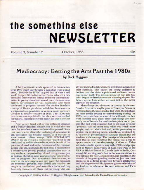 Higgins, Dick: the something else NEWSLETTER. Volume 3, Number 2. October, 1983. Mediocracy: Getting the Arts Past the 1980s by Dick Higgins. 1. Auflage. Barrytown. Printed Editions. 1983. 28 x 22 cm. 4 S. (1 Bogen). OPapier (2-fach gefaltet). Papierbedingt etwas nachgedunkelt, sonst sehr gutes Exemplar. Text in Englisch. Ohne Abbildungen.