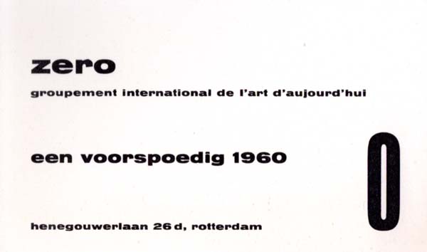 ZERO. van bohemen – dahmen – manzoni – pieters – romijn – sanders – schoonhoven – schumacher – tajiri – wagemaker. [Herasugegeben von] Hans Sonnenberg. Rotterdam. Hans Sonnenberg. [1959]. 28 unpaginierte S. OKarton. Kapital mit einem winzigen Riss, sonst sehr gutes und frisches Exemplar. Mit einem Text von C. Doelman in Niederländisch, Deutsch und Französisch, gesetzt auf verschiedenfarbigen Kartonpapieren. Zu den an der Ausstellung vom 1. bis 28. Juli im Rotterdamer Kunstkring beteiligten Künstlern Kees van Bohemen, Karl Dahmen, Piero Manzoni, Ian Pieters, Gust Romijn, Jan Sanders, Jan Schoonhover, Emil Schumacher, Shinkichi Tajiri, Jaap Wagemaker ist jeweils eine Arbeit sowie eine kurze Bio-Bibliographie wiedergegeben. Der Kunstring, eine Art „Offspace“, wurde damals von Hans Sonnenberg geleitet, der auch die Künstler zusammengeführt hat. Der etwas verwirrende Zusammenhang mit ZERO geht zurück auf eine – entäuschend verlaufene – Ausstellung von Piero Manzoni im Juli 1958 im Rotterdamer Kunstzentrum, „Groot Handelsgebouw“. Es kam zu einem Treffen Manzonis mit Sonnenberg und den niederländischen Künstlern Jan Schoonhoven und Gust Romijn zwecks Erörterung der Gründung einer internationalen Künstlergruppe, welche dann auf den Namen ZERO getauft wird. Kurz vor Eröffnung der geplanten Ausstellung im Juli 1959 informieren Heinz Mack und Otto Piene Sonnenberg, das er hinsichtlich der Namensgebung schlecht informiert war, da es bereits eine ZERO – Gruppe gäbe und er zur Vermeidung des Plagiatvorwurfs auf den Namen verzichten sollte. Manzoni tendiert zwar zu Mack, Piene und Uecker, bleibt aber der Gruppe trotzdem verbunden, die sich fortan OREZ nennt, ZERO rückwärtsgeschrieben. Als der eigentlichen Zero-Gruppe nahestehende Künstler dieser Ausstellungsgemeinschaft kann man eigentlich für die Folgejahre nur Schoonhoven und Manzoni betrachten. Der Katalog wurde für verschiedene Ausstellungen eingesetzt und mit unterschiedlich farbigen Einbänden herausgegeben. Er erschien ebenfalls für die Ausstellung der Galleria Appia Antica vom 24.10. – 4.11.1959 in Rom sowie im Hessenhuis 1960 in Antwerpen. Beiliegend eine Grußkarte mit Neujahrswünschen für 1960, hier noch mit der Bezeichnung ZERO (groupement international de l´art aujourd´hui). In dieser Erhaltung selten. [Vgl. Germano Celant. Manzoni. Neapel 2007, S. 160-161].