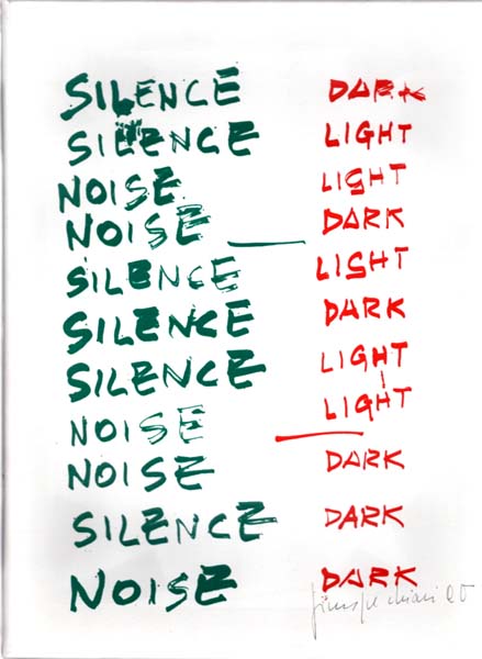Chiari, Giuseppe: Silence – Dark. First edition. Köln. Edition Hundertmark. 1995. Sehr gutes, frisches Exemplar. 143. Edidions-Box Edition Hundertmark. Farbiger Siebdruck in Grün und Rot auf weißer Leinwand in Keilrahmen. Eins von 26 Exemplaren, unten rechts signiert und datiert 95, hier nicht nummeriert.