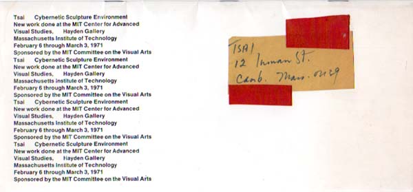 Tsai: Cybernetic Sculpture Environment. New Work done at the MIT Center for Advanced Visual Studies, Hayden Gallery. 1. Auflage. Cambridge. MIT Committee on the Visual Arts. 1971. 26 x 12 cm. 40 unpaginieret S. (aus einseitig beschichtetem Silberpapier). OKarton. Adresse Tsais auf dem Umschlag montiert, sonst sehr gutes Exemplar. Texte in Englisch. Mit Beiträgen von Gyorgy Kepes und Jonathan Benthall. Verzeichnet 11 schwarz-weiß Abbildungen. Auf dem Umschlag lose montiert die Adresse des Künstlers in seiner Handschrift.