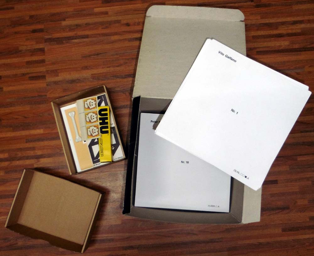 Olbrich, Jürgen O. (Herausgeber): 1…2…3 Dimensionen / 1…2…3 dimensions. Mail Art Ausstellung zur 3. Dimension / A mail-art project for the 3rd dimension. Harlekin Art, 21.6. – 12.7.1990. Wiesbaden. Harlekin Art. 1990. 21 x 21 x 21 cm. OKarton-Box. Minimale Gebrauchspuren. Gutes bis sehr gutes Exemplar. 202 Künstler und Künsterinnen haben anläßlich der geplanten Mail Art Ausstellung über einen längeren Zeitraum Arbeiten per Post an die Harlekin Art Edition gesendet. Diese sind in Form von 202 auf Karten wiedergegebenen Fotos dokumentiert (15,5 x 11,5 cm). Als Trägerkarten wiederum enthält die Box 202 Bögen mit Angaben zu Künstler und durch Piktogramme verschlüsselte Inhaltserklärungen, auf denen die Fotos zu montieren sind. Ferner dabei 3 Marken, ein Plastikknochen, 1 Tube UHU-Alleskleber sowie eine Zeichenerklärung zur Entschlüsselung der Piktogramme und eine Einführung.