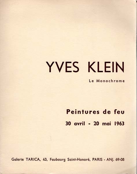 Klein, Yves: Yves Klein Le Monochrome. Peintures de feu, 30 avril – 20 mai 1963. Paris. Galerie Tarica. 1963. 28 x 22 cm. 1 Dioppelbogen, 4 Tafeln. OKarton-Mappe. Sehr gutes Exemplar. Der Katalog enthält, eingelegt in eine einfache Karton-Mappe, einen Doppelbogen mit Texten von Andre Verdet und Pierre Restany in Französisch, eine montierte Tafel mit einem Foto Yves Kleins beim „brennen“ eines Bildes sowie vier Tafeln mit Wiedergaben von Arbeiten