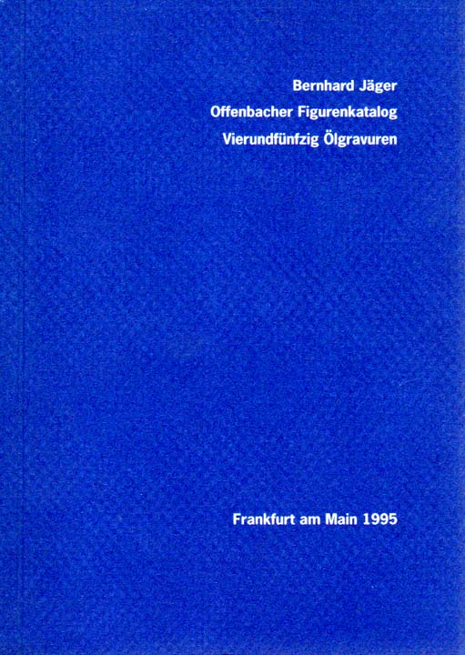 Jäger, Bernhard: Offenbacher Figurenkatalog. Vierundfünfzig Ölgravuren. 1. Auflage. Frankfurt am Main. Bernhard Jäger (Selbstverlag). 1995. 15 x 11 cm. OKarton mit Klappen. Einband mit wenigen Bereibungen. Gutes bis sehr gutes Exemplar. Durchgehend mit ganzseitigen Farbabblidungen versehen.