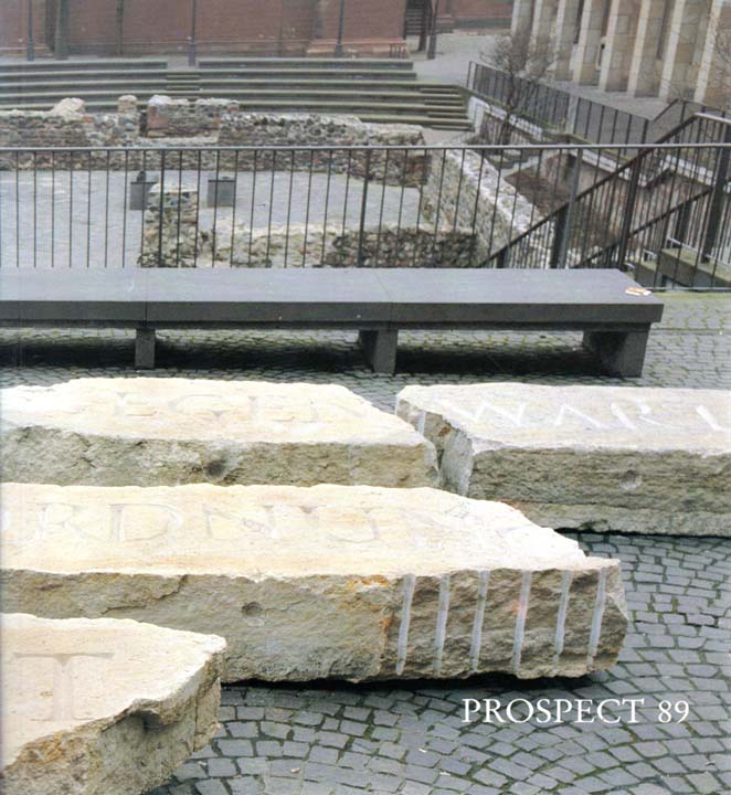 PROSPECT 89. Eine internationale Ausstellung aktueller Kunst. Frankfurter Kunstverein; Schirn Kunsthalle Frankfurt, 21.3.-21.5.1989. 1. Auflage. Frankfurt. Frankfurter Kunstverein / Schirn Kunsthalle. 1989. 23 x 21 cm. 304 S. OKarton. Sehr gutes Exemplar. Mit Textbeiträgen von Prof. Hilmar Hoffmann und Peter Weiermair sowie einiger beteiligter Künstler. Durchgehend mit meist farbigen Abbildungen versehen. 83 Künstler*innen aus 15 Ländern der westlichen Hemisphäre nahmen teil, unter anderem: Louise Bourgeois, Marlene Dumas, Ian Hamilton Finlay, Donald Judd, Mike Kelley, Ellsworth Kelly, Reiner Ruthenbeck und Nancy Spero. Eine Beilage.