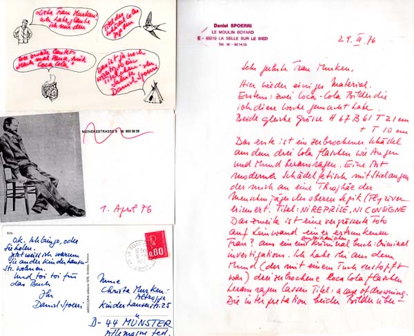 Spoerri, Daniel: Briefwechsel Daniel Spoerri mit einer Künstlerin und Autorin. 6 Blatt; 2 Karten. Sehr gutes Exemplar. Briefwechsel Daniel Spoerris mit Christa Murken-Altrogge von Januar bis Dezember 1976 bezüglich Ihres Buchprojekts „Coca Cola Art: Konsum, Kult, Kunst“, das allerdings dann erst 1991 bei Klinkhardt & Biermann in München erschien. Im Januar 1976 schreibt Spoerri auf ihre Anfrage hin, das er sich an keine einzige Flasche Coca Cola erinnern kann, die er in einem seiner vielen Tableau Piège oder auch anderen Objekten untergebracht hat, er habe vielleicht in seinem ganzen Leben 10 Flaschen Coca Cola getrunken und meistens Weinflaschen verwendet. Am Ende des Jahres, im November – inzwischen hat er zwei Objekte mit Cola Flaschen als Kern verarbeitet – versucht er die Wogen zu glätten, die er verursacht hat, als er eines der Objekte nicht an Frau Altrogge, sondern einen anderen Kunden verkauft hat und schließt diesen Brief mit „Ihr von Profitgier verseuchter Künstler bestimmten Formats“. Dazwischen liegt ein Jahr mit 6 teils umfangreichen Briefen und 2 Karten, in denen er Tipps gibt für die Recherche zum Buch gibt, das eine oder andere charmante Kompliment nonchalant einstreut und den einen oder anderen Ball souverän zurück schlägt. Im März beginnt er offenbar die Arbeit an zwei ersten Cola-Objekten. Das eine, „Ni reprise ni consigne“ (etwa „weder Pfand noch Rückgabe“) zeigt einen zersplitterten menschlichen Schädel vor blauem Grund ohne Oberkiefer, aus dessen Aushöhlung 3 Cola Flaschen ragen. An dem anderen Objekt, weniger schrecklich, wie Spoerri meinte, war die Briefpartnerin interessiert. Enthalten sind 6 meist ganzseitige handschriftliche Briefe, von denen einer aus drei Blatt transparentem Pergamin besteht, dicht beschrieben in roter Tinte (auf Blatt 2 mit einer montierten zerklatschten Mücke), einer enthält verso ein montiertes Polaroid Spoerris, 2 eine reproduzierte männliche Anatomie mit Klumpfuß als Briefkopf. Eine der beiden als Postkarten verwendeten Karten ist von Ben Vautier, „mobile“, die andere ist eine Karte von George Brecht aus der Serie ARROCARIA von 1975, in deren Sprechblasen der vier Figuren Spoerri seinen Text in roter Tinte setzte (etwas verwischt). Einem Brief liegen 2 Polaroids und eine Visitenkarte bei. Alle Briefe sind handschriftlich verfasst und signiert. [Vgl. zu den Objekten: Christa Murken Altrogge. Coca Cola art: Konsum, Kult, Kunst. S. 180ff mit Abbildung].