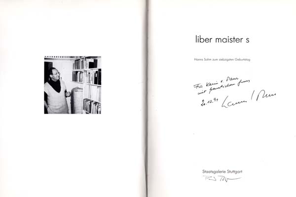 liber maister s. Hanns Sohm zum siebzigsten Geburtstag. Zusamengestellt von Ina Conzen-Meairs. Auflage 1000 Exemplare. Stuttgart. Staatsgalerie Stuttgart. 1991. 28 x 21 cm. 103 (1) S. OKarton mit OUmschlag. Sehr gutes Exemplar. Festschrift für Hanns Sohm, dessen umfangreiches Archiv mit künstlerischen Zeitdokumenten in der Staatsgalerie Stuttgart untergebracht ist. Sohm, von Beruf ehemals Zahnarzt, hatte seine Praxis in Markgröningen bei Ludwigsburg, wo er ursprünglich auch sein Archiv führte. Er sammelte schon früh Dokumente zu Fluxus, Neo-Dada, Wiener Aktionismus, Happening, Konkrete Poesie und Underground-Literatur. Mit sehr vielen Künstlern stand er in regem Austausch. Das „Archiv Sohm“ gehört heute sicherlich zu den bedeutendsten Sammlungen dieser Art in öffentlichen Einrichtungen. Die Festschrift enthält Beiträge von Ina Conzen-Meairs, Thomas Kellein, Harald Szeemann, Hermann Nitsch, Barbara Moore, Emmett Williams, Wolf Vostell, Milan Knizak, Nam June Paik, Herman de Vries, Daniel Spoerri, Hansjörg Mayer sowie zahlreichen Abbildungen. Dem Exemplar liegt eine Fotokopie eines Briefes von Dieter Roth an seinen ehemaligen Zahlarzt Hanns Sohm von 1991 mit Abbildung eines Röntgenbildes seiner Zähne bei. Roth konstatiert hier: „…gestern war ich beim Zahnarzt, hatte einen Zahn (unter Krone) zersetzt. Als er mit seiner Frau die Aufnahme (hier) gemacht hatte, sagten beide über Ihre Arbeit: DAS KANN MAN NICHT BESSER MACHEN […] Also nach so vielen Jahren, sage ich Ihnen nocheinmal: DANKESCHÖN!!“. Diese Kopie ist nur Exemplaren beiliegend, die Sohm persönlich verschenkte, hier an die damalige stellvertretende Direktorin der Stuttgarter Staatsgalerie, Karin von Maur, die entscheidenden Anteil am Zustandekommen der Übernahme des Archivs hatte. Ihr ist das Exemplar auf dem Titelblatt handschriftlich von Hanns Sohm gewidmet, signiert, datiert 20.12.1991. Darüber hinaus haben weitere 16 Künstler, Mitarbeiter der Staatsgalerie und weitere Beitragende das Buch signiert, mit Zeichnungen oder Widmungen versehen. Auf dem Titelblatt signierte Peter Beye, damaliger Direktor der Staatsgalerie, im Impressum Mitarbeiter des Museums, an der Gründung des Museums beteiligte oder am Zustandekoimmen der Publikation beteiligte: Bettina Kohl, Anne Kellein (Thomas Kellein hat eine längere Widmung unter seinem Foto auf Seite 18 verfasst, kopfüber, da er der Meinung war, nicht prominent genug zu sein für eine Signatur), Ina Conzen-Meair, Helmut Gerber, Anne Krauter und drei weitere nicht eruierbare Personen. Unter der Liste der Autoren und Künstler signierte ein Mitwirkender „in absentia“, auf dem hinteren Innendeckel unter dem Umschlag mit Grußworten Francesco Conz, ein wichtiger Sammler und Verleger des Wiener Aktionismus. Der Künstler Albrecht / d. verfasste eine Widmung vertikal zu einem Foto eines seiner Happenings, signiert und datiert mit gleichem Datum. Hermann de Vries und Emmett Williams manifestierten ihre Widmungen jeweils mit kleinen freundlichen Zeichnungen, beide jeweils signiert. Eine weitere Unterschrift steht auf Seite 98 scheinbar unzusammenhängend am Seitenrand, Dietrich Fiedler[?].