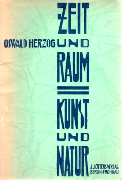 Herzog, Oswald: Zeit und Raum das Absolute in Kunst und Natur. 1. Tausend. Berlin. J. J. Ottens Verlag. [1928]. 23 x 16 cm. 62 S., 1 Blatt. OKarton. Einband am Rücken und vorne sowie hinten auf den Deckel übergehend aufgehellt. Sonst gutes Exemplar. Mit 2 Fototafeln und drei skizzierten Anordnungstafeln.