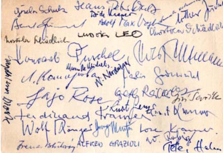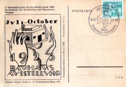 3. Internationales Bauhauskolloquium 1983. Weimar. Hochschule für Architektur und Bauwesen. 1983. 20 x 15 cm. 14 unpaginierte S. inklusive Umschlaginnenseiten. OBroschur, klammergeheftet. Umschlag gering berieben. Gutes Exemplar. Enthält ein Vorwort von G. Opitz, einen Ablaufplan, eine Gästeliste Ausland, Einträge aus dem Gästebuch, Bestände der Arbeiten ehemaliger Bauhausmeister, Studenten und Mitarbeiter, Ausstellungen etc. Mit 4 Fotoabbildungen. Beiliegend eine Postkarte, postalisch gelaufen mit einer Wiedergabe eines Postkartenentwurf´s von Gerhard Marcks zur Bauhaus-Ausstellung 1923, hier als Werbekarte für das Kolloquium 1983. Verso auf der unbedruckten Seite von 33 Teilnehmern handschriftlich in verschiedenen Stiften und Farben signiert. Eruiert sind davon 20 Namen von Bauhausmitarbeitern, ehemaligen Künstlern, ehemaligen Studenten und Wissenschaftlern: Magdalena Droste, Hajo Rose, Georg Muche, Waltraud Roßig (Witwe von Reinhold Roßig); Konrad Püschel, Alfredo Grazioli, Margarete Reichardt, Bernd Grönwald, Marlis Grönwald, Ferdinand Kramer, Winfred Nerdinger, Gisela Schulz, Hans Peter Schulz, Christian Schädlich, Ursula Schädlich, Jiri Sevcik, Ludwig Leo, Adolf Max Vogt, Lothar Juckel. Das Kolloquium fand statt vom 5. – 7. Juli 1983.