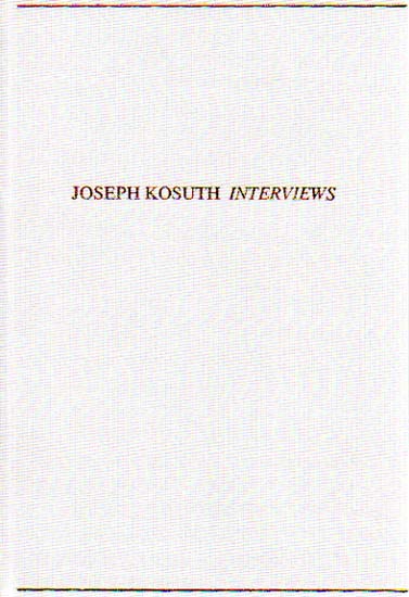Kosuth, Joseph: Interviews. 1969-1989. Erste Auflage. Stuttgart. Edition Patricia Schwarz. 1989. 21 x 14 cm. 159 S. OLeinen. Einband nachgedunkelt und angestaubt, recto minimal fleckig. Sonst gutes Exemplar. Texte in Englisch. Mit einem Vorwort von Charles Le Vine und 15 Interviews. Enthält einige Abbildungen, teilweise in Farbe.