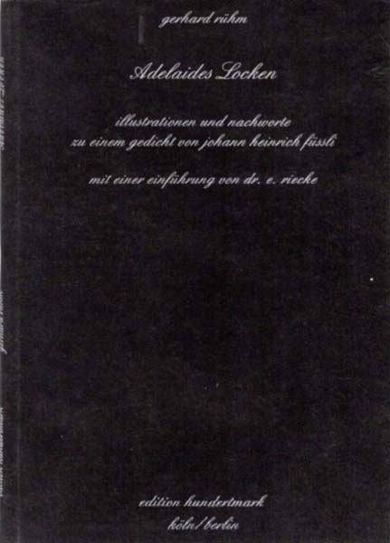 Rühm, Gerhard: Adelaides Locken. Illustrationen und Nachworte zu einem Gedicht von Johann Heinrich Füssli. Mit einer Einführung von Dr. E. Riecke. 500 Exemplare. Köln/ Berlin. Edition Hundetmark. 1979. 21 x 15 cm. 48 S. OKarton mit Klappenbroschur. Umschlag minimal berieben. Sehr gutes Exemplar. 51. Karton, 7. Buch. Textband, mit 13 ganzseitigen Zeichnungen versehen.