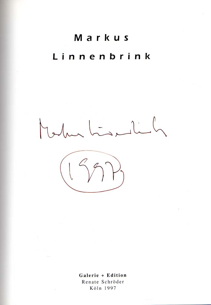 Linnenbrink, Markus: Markus Linnenbrink. Auflage: 600 Exemplare. Köln. Galerie + Edition Renate Schröder. 1997. 27 x 20 cm. 29 S. OKarton. Sehr gutes Exemplar. Titelblatt handschriftlich von Markus Linnenbrink signiert, datiert 1997. Text in Deutsch und Englisch. Mit einem Beitrag von Renate Puvogel. Durchgehend mit farbigen Abbildungen versehen.