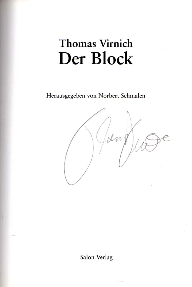 Virnich, Thomas: Der Block. Herausgegeben von Norbert Schmalen. Auflage: 700 Exemplare. Köln. Salon Verlag. 1998. 25 x 17 cm. 61 S., 1 Blatt. OPappband. Sehr gutes Exemplar. Auf dem Titelblatt handschriftlich von Thomas Virnich in Bleistift signiert. Mit einem Gespräch zwischen Thomas Virnich und Norbert Schmalen sowie mit einem Text von Swantje Britt-Koerner. Durchgehend mit Abbildungen versehen, davon viele in Farbe. Erschien anlässlich der Ausstellung im Kunstraum Heinsberg, 12.4. bis 18.5.1997. Beiliegend: Einladung (Leporello) zur Ausstellung, verso signiert.