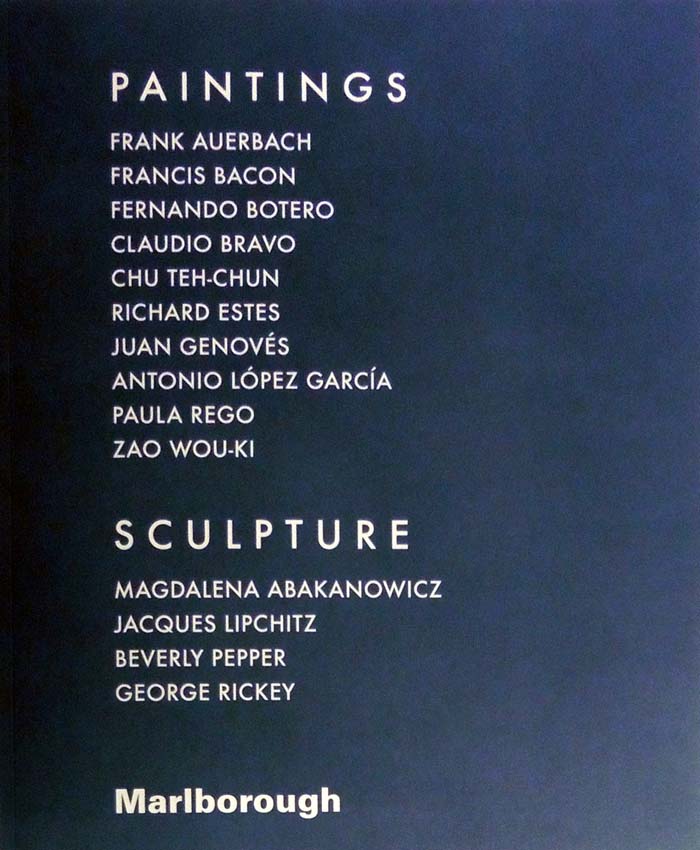Paintings and Sculpture. Magdalena Abakanowicz, Frank Auerbach, Francis Bacon, Fernando Botero, Claudio Bravo, Chu Teh-Chun, Richard Estes, Juan Genoves, Jacques Lipchitz, Antonio Lopez Garcia, Beverly Pepper, Paula Rego, George Rickey, Zao Wou-Ki. Marlborough Gallery, April 30-June 29, 2019. 1. Auflage. New York. Marlborough Gallery, Inc. 2019. 30 x 25 cm. 32 S., 3 Blatt. OKarton. Seitlicher Schnitt gering bestoßen, sonst sehr gutes Exemplar. Durchgehend mit farbigen Abbildungen versehen, teilweise auf Klapptafeln.