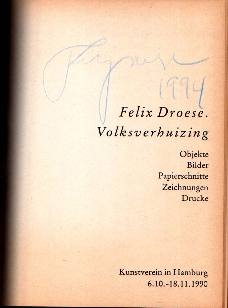 Droese, Felix: Volksverhuizing. Objekte, Bilder, Papierschnitte, Zeichnungen, Drucke. Kunstverein in Hamburg, 6.10.-18.11.1990. 1. Auflage. Hamburg. Kunstverein. 1990. 28 x 20 cm. 81 S., 1 Blatt. OKarton mit OUmschlag. Papier insgesamt etwas nachgedunkelt, Umschlagkanten etwas berieben, sonst gutes Exemplar. Titelblatt großflächig von Felix Droese in blauem Buntstift signiert, datiert 1994. Text von Jürgen Schweinebraden Frhr. v. Wichmann-Eichhorn. Durchgehend mit schwarz-weiß Abbildungen versehen.
