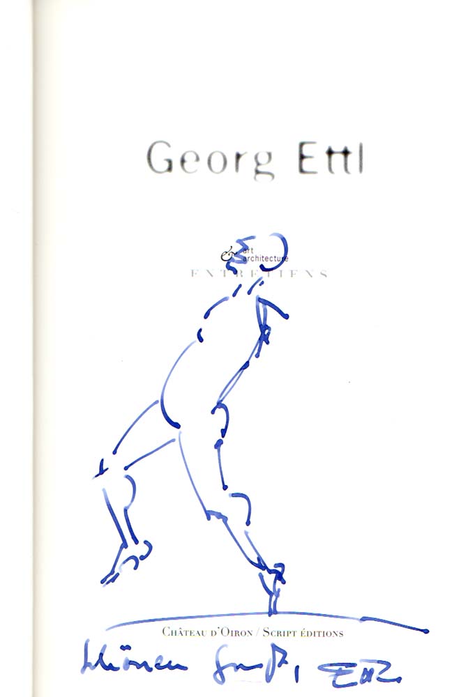 Ettl, Georg: ENTRETIENS. 1. Auflage. Bordeaux. Script Editions. 1997. 19 x 13 cm. 79 S. OKarton mit Klappen. Einband leicht angestaubt, sonst gutes Exemplar. Titelblatt mit einer Original-Zeichnung von Georg Ettl in blauer Tinte, signiert. Texte in Französisch. Durchgehend mit meist farbigen Abbildungen versehen.