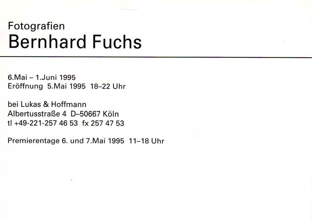 Fuchs, Bernhard: Fotografien. [Einladungskarte / Invitation Card] Lukas & Hoffmann, 6. Mai-1. Juni 1995. Köln. Lukas & Hoffmann. 1995. 10,5 x 15 cm. OKarton-Klappkarte. Sehr gutes Exemplar. Einladungskarte. Abbildung: ohne Titel, 1994.