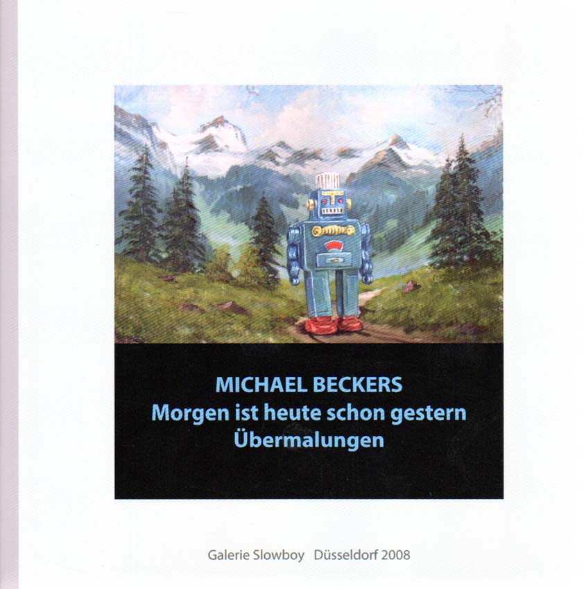 Beckers, Michael: Morgen ist heute schon gestern – Übermalungen. Galerie Slowboy, Düsseldorf, 8.-28. März 2008. 1. Auflage. Düsseldorf. Galerie Slowboy. 2008. 21 x 21 cm. 30 unpaginierte S., Audio-CD (Spielzeit: 6:02 Minuten). OKarton. Sehr gutes Exemplar. Titelblatt handschriftlich von Michael Beckers signiert. Durchgehend mit meist ganzseitigen Farbabbildungen versehen. Beiliegend: Einladungskarte zur Eröffnung der Ausstellung, handschriftlich von Michael Beckers signiert.