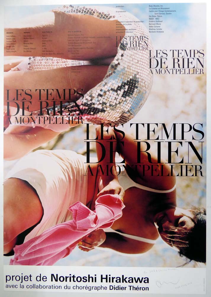 Hirakawa, Noritoshi: LES TEMPS DE RIEN A MONTPELLIER. [Plakat / Poster] projet de Noritoshi Hirakawa. avec la collaboration du choregraphe Didier Theron. poster design: Osamu Misawa. 1. Auflage. 2006. 84 x 59 cm. OKarton-Plakat. Sehr gutes Exemplar. Unten rechts in Bleistift mit handschriftlicher Widmung von Noritoshi Hirakawa an ein deutsches Sammler-Ehepaar versehen, signiert, datiert MAR 17th, 2006.