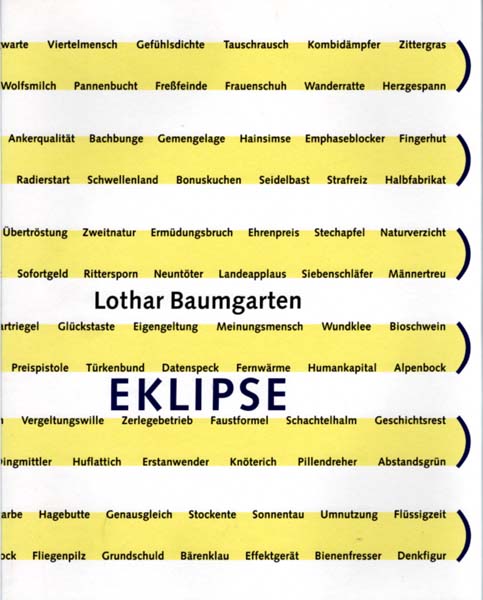 Baumgarten, Lothar: Eklipse. Auflage 650 Exemplare. Düsseldorf. Richter Verlag. 1997. 34 x 27 cm. 64 S. OKarton. Sehr gutes Exemplar. Exemplar der Normaslausgabe des Künstlerbuches, nicht signiert und nummeriert. Durchgehend mit Abbildungen versehen.
