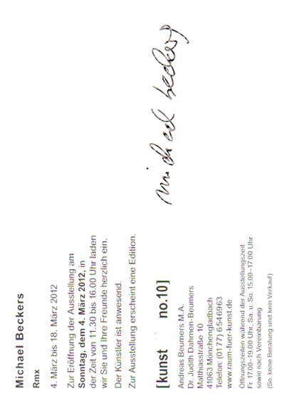 Beckers, Michael: Rmx. [Einladungskarte / Invitation Card] [kunstraumno.10], 4. März bis 18. März 2012. Mönchengladbach. [kunstraumno.10]. 2012. 15 x 10,5 cm. OKarton-Karte. Sehr gutes Exemplar. Einladungskarte, verso handschriftlich von Michael Beckers signiert.