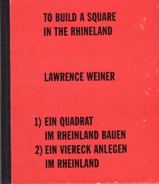 Weiner, Lawrence: To build a Square in the Rheinland / Ein Quadrat im Rheinland bauen – Ein Viereck anlegen im Rheinland. Deutsch von Karin Graf, Durs Grünbein, Joachim Sartorius. Mit einem Nachwort von Reiner Speck. Auflage 180 Exemplare. Köln. Verlag der Buchhandlung Walther König. 1995. 11,0 x 9,5 cm. 44unpaginierte S. OHalbleinen. Bezugspapier des Voderdeckels gering berieben, sonst sehr gutes Exemplar. Nummer 57 / 180 (gesamt 700) im Impressum nummerierten und von Lawrence Weiner handschriftlich in Bleistift signierten und 1995 datierten Exemplaren [nicht wie im Impressium angegeben nur monogrammiert]. Durchgehend mit Schwarz-Weiss Abbildungen versehen. [Vgl. As far as the eye can see. MOCA 2007, S. 371].