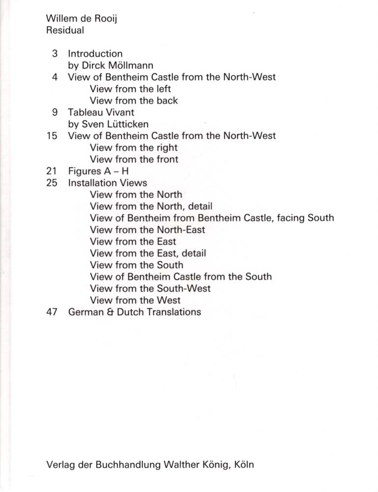 Rooij, Willem de: Residual. [produced as part of the sculpture project kunstwegen raumsichten, 2012]. 1. Auflage. Köln. Verlag der Buchhandlung Walther König. 2012. 29 x 22 cm. 62 S. OPappband. Einige ausradierte Unterstreichungen in der deutschen Übersetzung, sonst gutes bis sehr gutes Exemplar. Texte in Englisch, Deutsch und Niederländisch. mit einem Beitrag von Sven Lütticken sowie einer Einleitung von Dirck Möllmann.