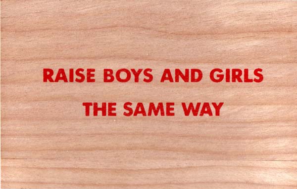Holzer, Jenny: Raise Boys and Gilrs the same Way. (Truism Postcard). 1st Class Letter Stamp. 9 x 15 cm. Sehr gutes Exemplar. Holzpostkarte mit Truism-Zitat ″ Raise Boys and Gilrs the same Way“ von Jenny Holzer, um 1995 in Siebdruck.