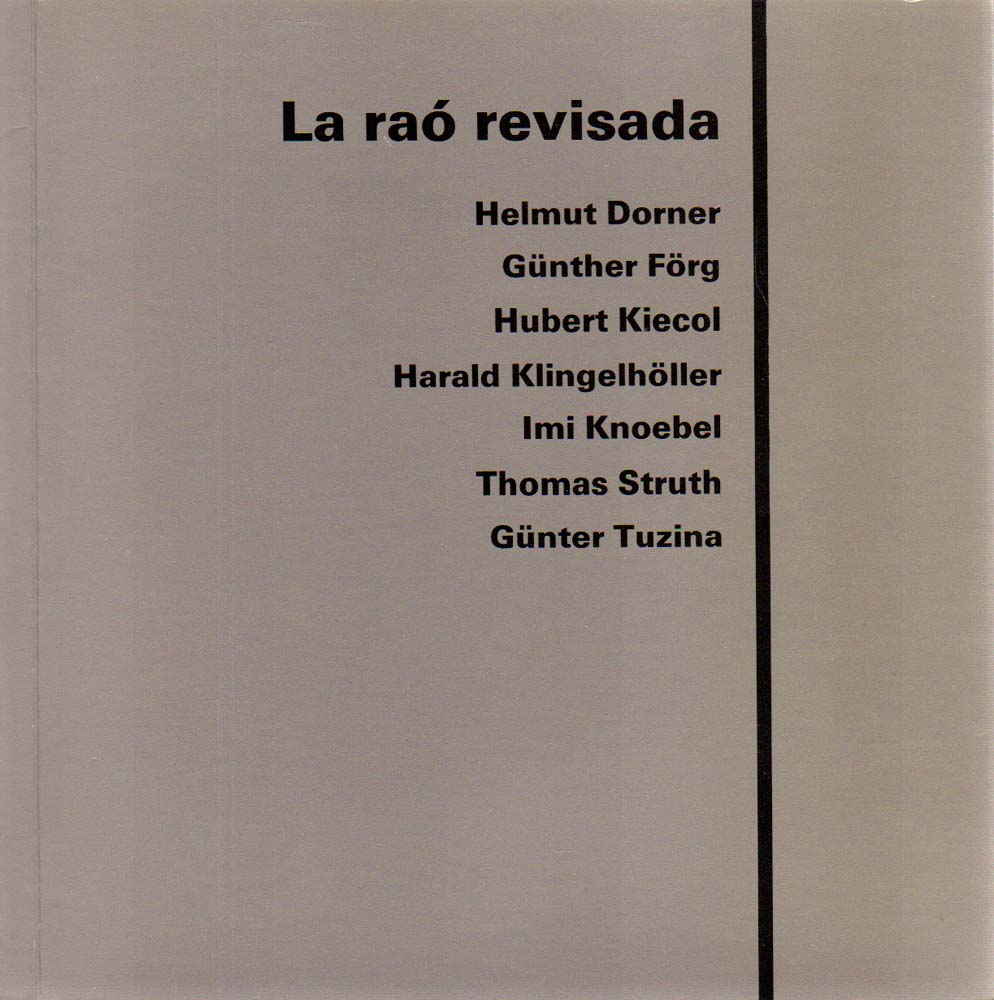 La rao revisada / Reason revised. Helmut Dorner, Günther Förg, Hubert Kiecol, Harald Klingelhöller, Imi Knoebel, Thomas Struth, Günter Tuzina. CENTRE CULTURAL DE LA FUNDACIO CAIXA DE PENSIONS, Barcelona, 28 de setembre-13 de novembre de 1988. 1. Auflage. Barcelona. CENTRE CULTURAL DE LA FUNDACIO CAIXA DE PENSIONS. 1988. 21 x 21 cm. 135 S. OKarton mit Klappen. Schnitt und Seitenränder etwas nachgedunkelt, sonst gutes Exemplar. Texte in Englisch und Spanisch. Mit Beiträgen von Stephan Schmidt-Wulffen und den Künstlern. Durchgehend mit meist farbigen Abbildungen versehen.