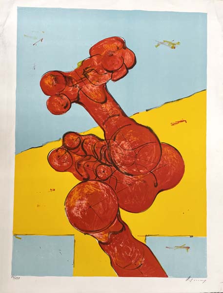 Hoflehner, Rudolf: Komposition mit roten Formen. Kleiner, wenig auffälliger Einriss am rechten Rand im unteren Drittel des Blattes. Blattrand mit leichten Druckstellen im Papier. Gutes Exemplar. Farblithographie, 65 x 50 cm auf Bütten, Nummer 46 / 150 unten links im Rand nummerierten, rechts signierten Exemplaren. Um 1966.