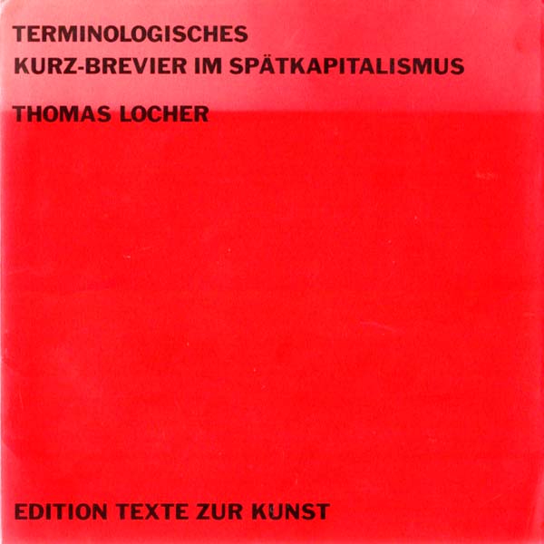 Locher, Thomas: Terminologisches Kurz-Brevier im Spätkapitalismus. Köln. Edition Texte zur Kunst. 1991. 30 x 30 cm. 14 unpaginierte Blatt. OKarton. Vorderer oberer Steg auf 6 cm, hinterer Rückenrand auf 3 cm Breite aufgehellt. Kanten gering knitterspurig. Sonst gutes Exemplar. Edition Texte zur Kunst. Leporello, auf dem hinteren Innendeckel mointiert ausfaltbar, mit 12 Textblättern. Diese enthalten, mit Perforationslinien versehen, Begriffe, die sich unmittelbar mit dem sogenannten Spätkapitalismus in Verbindung bringen lassen und den Theorien des Marxismus und der Psxchoanalyse entstammen, wie unter anderem: Masse, Reproduktion, KAPITAL, Macht, Ware, Herr, Knecht, Fetisch, Konsens, GELD, Ideologie, Spekulation , Modell, Arbeit, Objekt etc. Die Perforationslinien sollen dazu animieren, die Begriffe auszuschneiden und im individuellen Gebrauch einzusetzen. Nummer 80 / 100 im Kolophon handschriftlich nummerierten und von Thomas Loch er signierten Exemplaren, datiert 1991. Erschien als Edition anläßlich der Herausgabe der Nummer 2 der „Texte zur Kunst“ im März 1991. Gedruckt bei Winterscheidt in Düsseldorf.