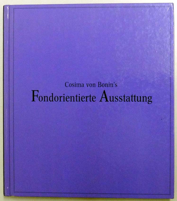 Bonin, Cosima von: Cosima von Bonin’s Fondorientierte Ausstattung. [Neue Galerie am Landesmuseum Joanneum Graz, 27. Oktober-1. Dezember 2002]. 1. Auflage. Ostfildern-Ruit. Hatje Cantz Verlag. 2002. 26 x 23 cm. [190] unpaginierte S. OPappband mit Lesebändchen. Einbandkanten teilweise etwas berieben, sonst gutes Exemplar. Durchgehend mit ganzseitigen Abbildungen versehen, teilweise in Farbe.