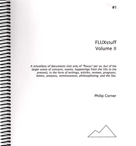 Cornert, Phgilip: FLUXstuff Volume I and II. A miscellany of documents (not only of „fluxus“ pere se, but of the larger scene of concerts, events, happenings from the 50s to the present), in the form of writings, articles, reviews, programs, letters, analyses, reminiscences, philosophizing and the like. First printing. 2 Volumes. Lebanon / New Hampshire. Frog Peak Music (a compossers collective). Um 2015. 28 x 23 cm. Unpaginiert, ca. 500 S. OBroschur, Spiralbindung. Sehr gutes Exemplar. 2 Copybooks, durchgehend mit Kopien von Dokumenten, Briefen, Arbeiten, Zeitungsartikeln etc. zu Hapenings, Aktionen und Performances und weiterem versehen. Texte in Englisch.