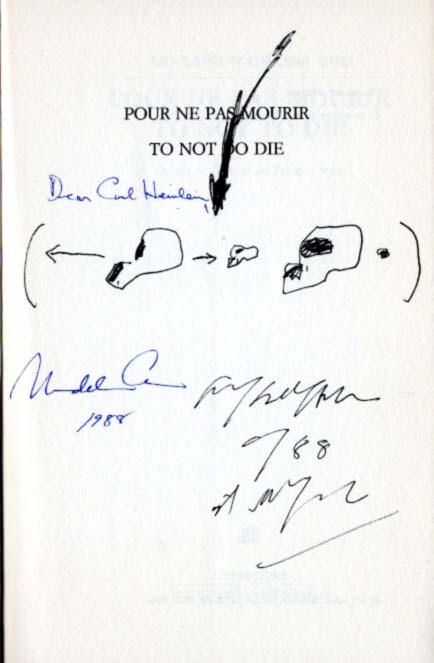 Arakawa / Madeline Gins: Pour ne pas mourir / To not to die. Traduit de l´anglais par Francois Rosso. Premiere edition. Paris. Editions de la Difference. 1987. 23 x 15 cm. 122 S., 3 Blatt. OKarton mit OKlappenumschlag. Einband minimal angestaubt. Sehr gutes Exemplar. Widmungsexemplar von Madeline Gins und Shusaku Arakawa für den ehemaligen Direktor der Kestner Gesellschaft Curt Haenlein (hier etwas falsch geschrieben), mit einer handschriftlichen Zueignung und Zeichnung von Arakawa sowie einer Zueignung und Signatur von Madeline Gins, beide datiert 1988. Texte in Englisch und Französisch.
