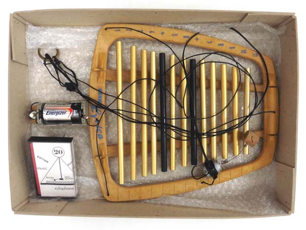 Jones, Joe: music machine xylophone. [Berlin]. [Edition Hundertmark]. [1976]. OPapp-Box. Es fehlt das Deckeletikett sowie das Zertifikat, sonst gutes Exemplar. 45. Editions Box. Multiple- Holz, Metall, Kork, Kabel, Karton. 24 x 80 x 10 cm in Original-Papp-Box (ohne das Etikett). Xylophon mit Elektromotor, Batteriebetrieben, mit Hängevorrichtung. Mit einem beiliegenden Konstruktionsplan in Siebdruck auf leichtem Karton, hier aber nicht wie üblich signiert und nummeriert! Mit einer Kassette mit Musikbeispielen der 20 erschienenen Xylophone. (Das Musikinstrument ist voll funktionsfähig, die Batterie muss ausgetauscht werden). Exemplar außerhalb der regulär herausgegegebenen 20 Exemplare, nicht signiert, ohne Editionsnachweis. (Deutlich im Preis berücksichtigt).