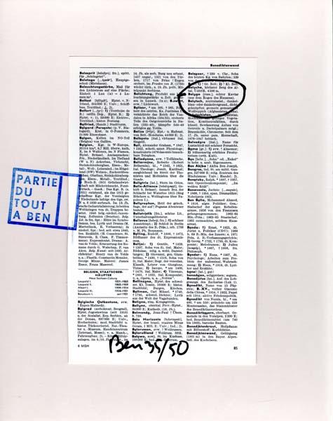 Vautier, Ben: Partie di tout a Ben. Köln. Edition Hundertmark. 1986. 30,5 x 24,0 cm. 1 Blatt., Sehr gutes Exemplar. Edition aus dem 100. Karton der Edition Hundermark 1986: Papier, Karton, Filzstiift, Stempel. Eins von 50 (gesamt 150) Künstlerexemplaren, von Ben Vautier handschriftlich nummeriert 35 / 50, signiert und mit einem Titelstempel in Blau versehen. Als Zeichnung ist in der Dritten Spalte einer auf Karton montierten Lexikonseite oben rechts eine Markierung mit schwarzem Filzstift vorgenommen.