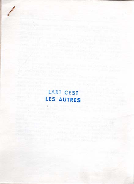 Vautier, Ben: L’art c’est les autres. Nice. Selbstverlag Ben Vautier. (1966). 16,5 x 21,5 cm. 11 unpaginierte Blatt, geklammert. Sehr gutes Exemplar. Titel in Blau gestempelt, 11 lose Blatt, geklammert. Enthält den Text ‚La table‘ von Ben und auf dem letzten Blatt von Robert Filliou ‚1 Enumeration‘. Rückseitig handschriftlich mit Bleistift bezeichnet „März 66 von Ben Vautier geschenkt erhalten.“ [Geschenk von Erik Andersch, der das Heft 1966 von Ben Vautier erhielt, an den Vorbesitzer].