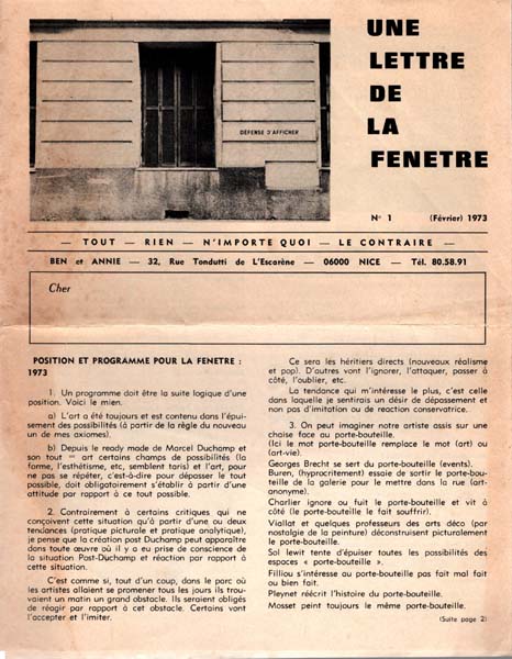 Vautier, Ben: Une lettre de la fenetre. N° 1 (Fevrier) 1973. Tout – Rien – N´importe Quoi – Le contraire. Ben et Annie, Nice. Premiere edition. Nice. Selbstverlag Ben Vautier. 1973. 27 x 21 cm. 8 S. Paoer etwas gebräunt, vorne am linken Rand etwas fleckig. Mittig gefalzt. Noch gutes Exemplar. Nummer 1 der von Ben Vautier gemeinsam mit seiner Frau herausgegebenen Zeitung, mit der sie die Neugründung ihrer Galerie bewerben wollten. Offset-Zeitungsdruck, mehr nicht erschienen.Texte und Abbildungen von Marcel Alocco, George Brecht, Remi Escault, Sabine Gowa, Olivier Mosset und anderen.
