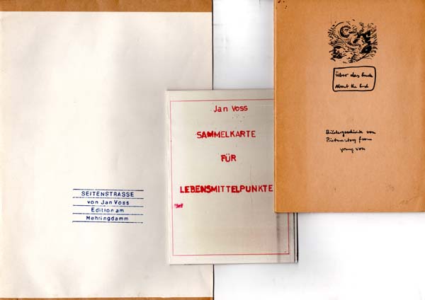 Voss, Young [Jan]: Über das Ende / About the End. Bildergeschichte von / Picturestory from Young Voss. Ohne Ort. Selbstverlag Jan Voss. (1975). 21 x 15 cm. 11 Blatt Leporellodruck. OKarton. Einband lichtrandig und minimal fleckig. Gutes Exemplar. Zehnteiliges Leporello in zweifarbigem Offsetdruck. Mit einem Text zu Jan Voss von W. Emil Schult auf der Umschlagrückseite. Exemplar außerhalb der 250 signierten Exemplare. Beiliegend: Sammelkarte für Lebensmittelpunkte. Leporello von Jan Voss, fünfteilig als Lebensmittgelpass mit Freifeldern für Marken (blanko). Ferner dabei: SEITENSTRASSE von Jan Voss. Edition am Mehringdamm. Vierteilige Leporellografik mit vier Lithographien, mittig nummeriert 52 / 100, signiert und datiert 1979. In Kuvertmappe, Titelstempel. Zusammen drei Leporelloeditionen von Jan Voss.