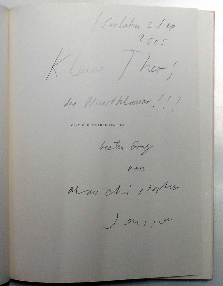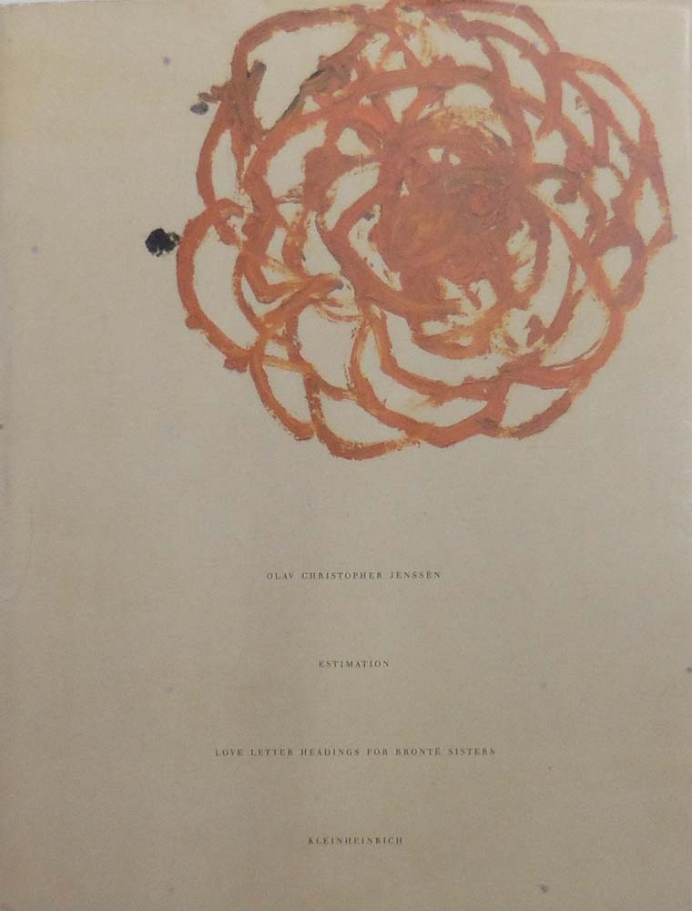 Jenssen, Olav Christopher: ESTIMATION. LOVE LETTER HEADINGS FOR BRONTE SISTERS. Auflage: 800 Exemplare. Münster. Kleinheinrich Verlag. 1997. 33 x 26 cm. [100] unpaginierte S. OLeinen mit montiertem Titelschild und OUmschlag. Umschlag gering gebrauchsspurig, sonst gutes Exemplar. Großformatige Widmung (″Kleine Theo; der Wurstklauer!!!“) handschriftlich in Bleistift von Olav Christopher Jenssen auf dem Vorsatz, signiert, datiert „Iserlohn 2 Sep 2005“. Text von Gertrud Sandquist in Englisch und Deutsch.