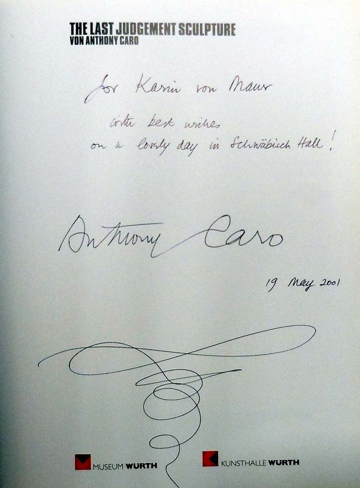 Caro, Anthony: THE LAST JUDGEMENT SCULPTURE. MIT BEITRÄGEN VON PETER BAELZ, GIOVANNI CARANDENTE, HANS MAGNUS ENZENSBERGER, NADINE GORDIMER, ROBERT HINDE, PHILIP RYLANDS, FRANCISCO CALVO SERRALLER, JOHN SPURLING UND FOTOGRAFIEN VON DAVID BUCKLAND. [Sammlung Würth, Johanniterhalle, Schwäbisch Hall, 20.5.-23.9.2001]. 1. Auflage. Künzelsau. Swiridoff Verlag. 2001. 31 x 25 cm. 208 S. OKarton mit OUmschlag. Umschlag minimal berieben, Einriss an der Falzspur der vorderen Umschlagklappe, sonst gutes Exemplar. Großflächige handschriftliche Widmung von Anthony Caro auf dem Vorsatz, signiert, datiert „19 May 2001“. Durchgehend mit meist farbigen Abbildungen versehen.