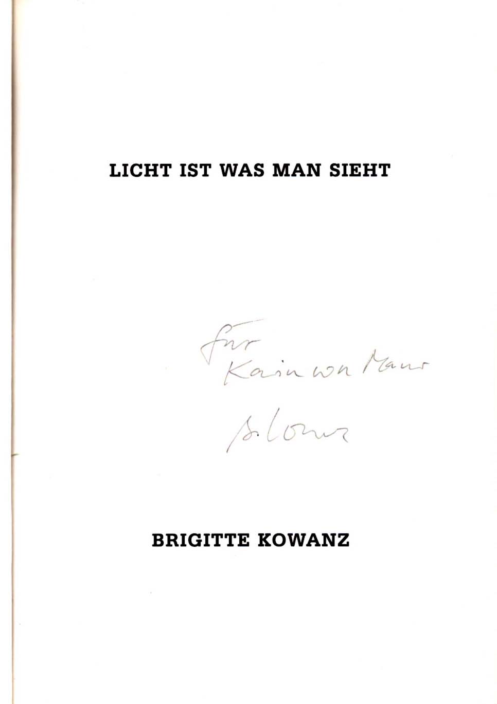 Kowanz, Brigitte: Licht ist was man sieht. 1. Auflage. Wien. Triton Verlag. 1997. 24 x 17 cm. 75 S. OKarton. Gutes Exemplar. Titelblatt mit einer handschriftlichen Widmung von Brigitte Kowanz, signiert. Außerdem mit einem beiliegenden Zettel mit einem kurzen handschriftlichen Text von Brigitte Kowanz, signiert. Texte in Deutsch und Englisch. Mit Beiträgen von Rainer Fuchs und Rainer Metzger. Durchgehend mit meist farbigen Abbildungen versehen.