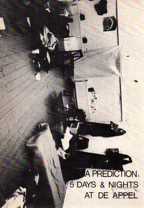 A PREDICTION: 5 DAYS & NIGHTS AT DE APPEL. [De Appel, Amsterdam, October 31 to November 4, 1978]. 1. Auflage. Amsterdam. De Appel. 1978. 24 x 17 cm. 32 S. OKarton. Einband leicht nachgedunkelt und an den Kanten gering berieben, kleiner Fettfleck auf den Seiten 16-19, sonst gutes Exemplar. Durchgehend mit schwarz-weiß Abbildungen versehen.
