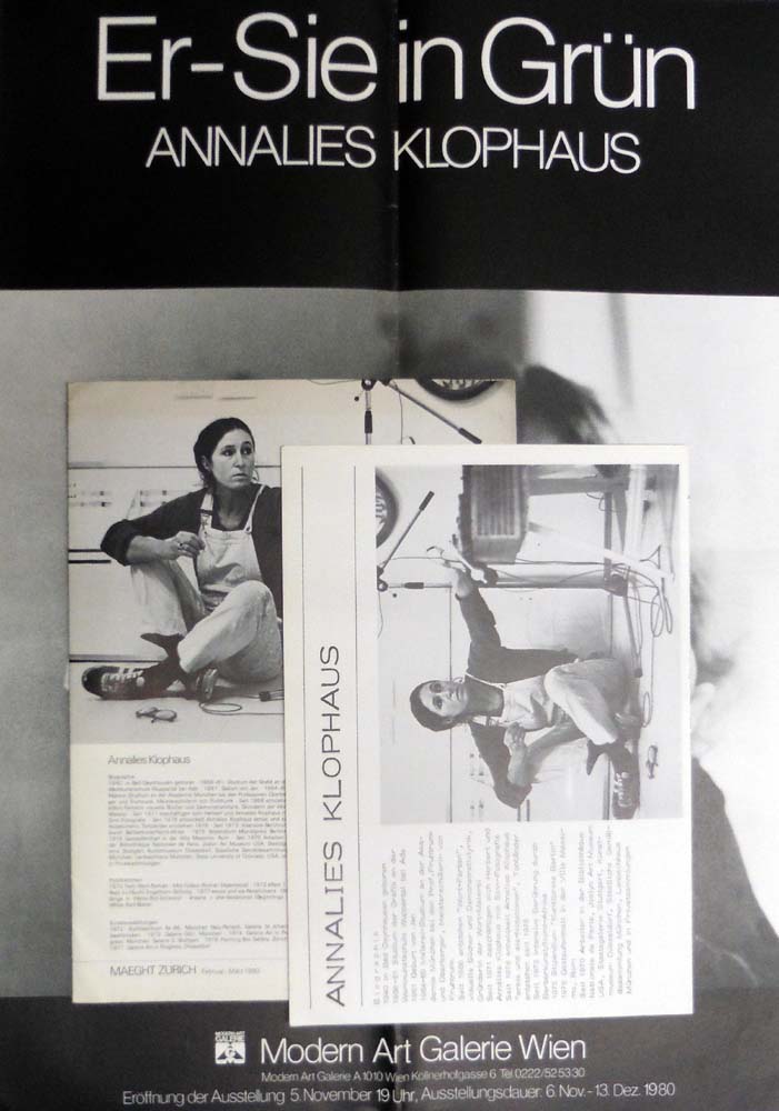 Klophaus, Annalies: Annalies Klophaus. MAEGHT ZÜRICH, Februar-März 1980. 1. Auflage. Zürich. Galerie Maeght. 1980. 32 x 23 cm. 8 unpaginierte S., 1 beiliegendes Faltblatt. OKarton. Einband leicht nachgedunkelt, Kanten teilweise minimal gestaucht, sonst gutes Exemplar. Mit schwarz-weiß Abbildungen (teilweise auf Pergamentpapier) sowie einem Interview von Keto von Waberer mit Annalies Klophaus. Beiliegend: Faltblatt zur gleichen Ausstellung (mit Notiz und Anstreichnungen) sowie Faltplaket zur Ausstellung „Annalies Klophaus: Er-Sie in Grün“, Modern Art Galerie Wien, 1980.