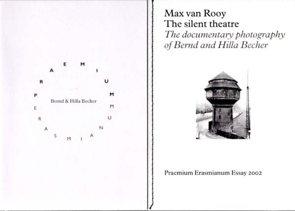 Becher, Bernd & Hilla – Max van Rooy: The silent theatre. The documentary photography of Bernd and Hilla Becher. Praemium Erasmianum Essay 2002. 1. Auflage. 2 Bände. o.O. [Den Haag]. Selbstverlag. o.J. [2002]. 21 x 14,9 cm. 36 S. Illustrierte OBroschur mit Naht. Sehr gutes Exemplar. Durchgehend mit schwarz-weißen Abbildungen versehen. Beiliegend in vergleichbarer Ausstattung und Größe ein Programmheft (8 unpaginierte Doppelseiten, oben unaufgeschnitten) anläßlich der Verleihung des Praemium Erasmianum an Bernd und Hilla Becher.