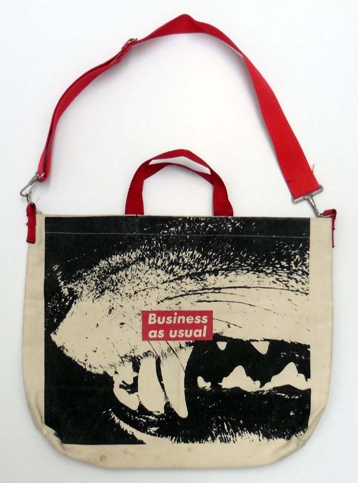 Kruger, Barbara: Business as Usual. [Umhängetasche aus Leinen / Canvas Messenger Bag]. Auflage: Insgesamt 800 Exemplare. New York, NY. Printed Matter, Inc. 1990 – 2001. 51 x 42 cm. OLeinentasche mit Innentasche und Schultergurt. Tasche Innen und am Boden etwas stockfleckig, sonst gutes Exemplar. Diese stabile Umhängetasche (von Hand mit einem Siebdruck von Barbara Kruger versehen) ist eine zwischen 1990 und 2001 mittels Fundraise Kampagne finanzierte Kooperation von Barbara Kruger und Printed Matter, New York. Das verwendete Motiv eines knurrenden Hundemauls in Zusammenspiel mit dem Text „Business as usual“ ist als Kritik an unlauteren Geschäftspraktiken zu verstehen. Die Tasche ist aus schwerem Leinen gefertigt und verfügt über einen stabilen Schultergurt sowie eine Innentasche. Die Tasche wurde in 2 limitierten Auflagen gedruckt (1. Auflage 1990 in 500 Exemplaren, 2. Auflage 2001 in 300 Exemplaren). [Hier ein selteneres Exemplar der Erstauflage, vom Vorbesitzer Anfang 1994 in New York erworben].