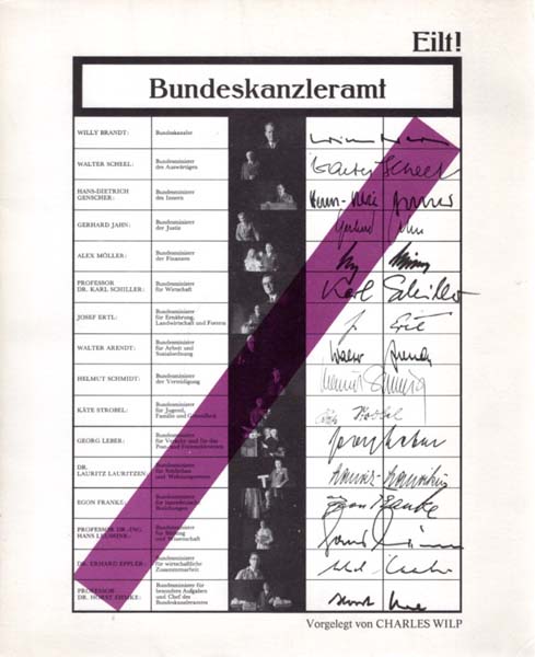 Wilp, Charles / Doris van Sorp: Bundeskanzleramt. Eilt! Vorgelegt von Charles Wilp. Idee + Ausführung: Doris van Dorp in Zusammenarbeit mit INTER NATIONES. Bonn-Bad Godesberg, 1970. Erste Auflage. Düsseldorf. Organisation-Charles Wilp / A. Bagel. 1970. 35 x 28,7 cm. [67] unpaginierte S. Illustrierter, flexibler OKarton. Einband minimalst angestaubt und wenig lichtschattig, sonst sehr gutes Exemplar. Durchgehend mit meist farbigen Abbildungen versehen. Der Einband wie eine Aktenmappe mit Laufzettel gestaltet, auf dem sich der damalige Bundeskanzler Willy Brandt mit seinem aus 15 Personen bestehenden Kabinett (Kabninett Brandt I / Sozialliberale Koalition) mit jeweiliger (fotographisch abgebildeter) Unterschrift verewigt hat. Innen ganzseitige Abbildungen des Bundeskanzlers und seiner Ministerin und seinen Ministern vor dunklem Hintergrund und mit z. Tl. ungewöhnlichen „Accessoires“. Abgebildet sind Willy Brandt, Walter Scheel, Hans-Dietrich Genscher, Gerhard Jahn, Alex Möller, Professor Karl Schiller, Josef Ertl, Walter Arendt, Helmut Schmidt, Käte Strobel, Georg Leber, Dr. Lauritz Lauritzen, Egon Franke, Professor Dr. Ing. Hans Leussink, Dr. Erhard Eppler und Professor Dr. Horst Ehmke.